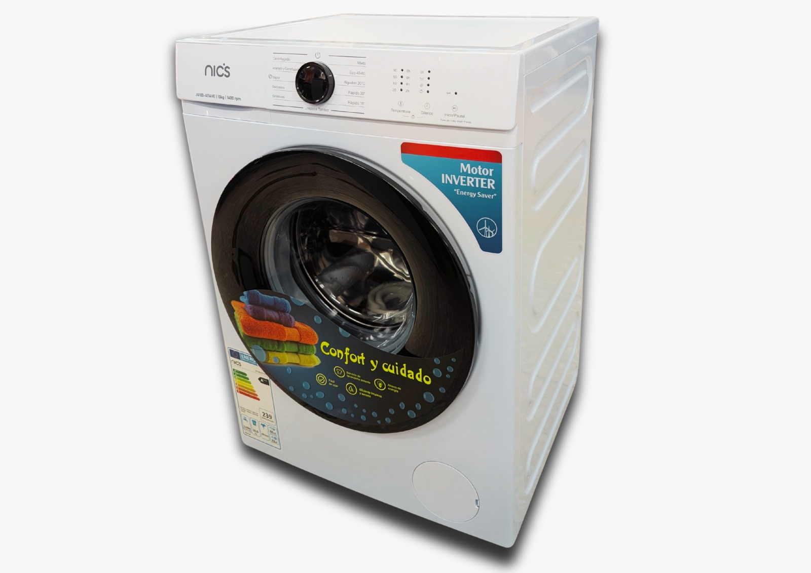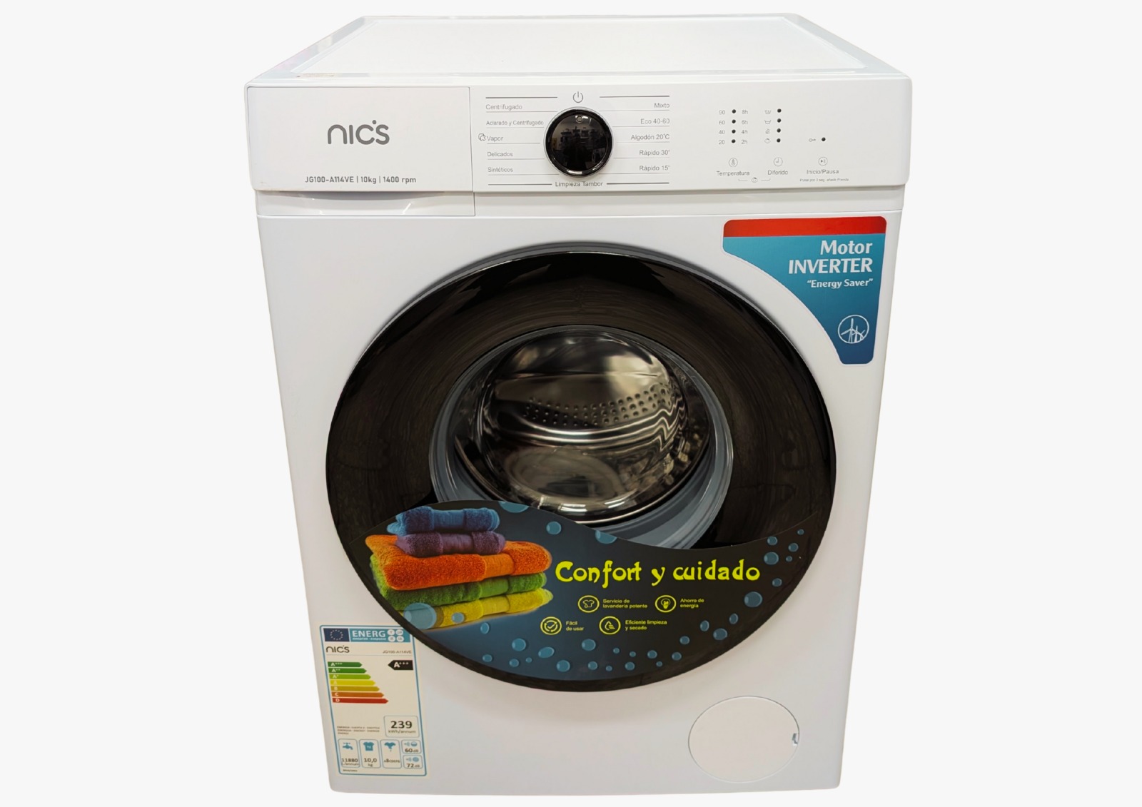 Modelo: JG100-A114VE Moto-compresor Inverter Rendimiento Energético: A+++ Capacidad: 10 Kg RPM: 1.400 Programas de lavado: 11