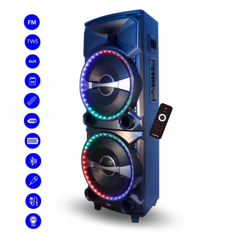 Modelo: NRD-S4252 Altavoces: Doble de 12 pulgadas Potencia: 3000 W (PMPO) Conectividad: Bluetooth, USB, Micro SD, Auxiliar 3,5 mm Batería: Recargable 11.1V/4500mAh Luces LED: Giratorias Radio FM: Sí