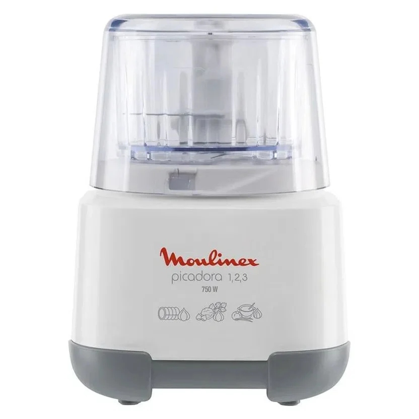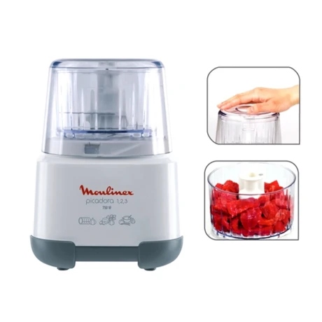 La Picadora 1 2 3 de Moulinex pica toda clase de alimentos incluso carne cruda en 3 pulsos cuchillas de acero inoxidable bowl hermético que evita cualquier tipo de filtración.